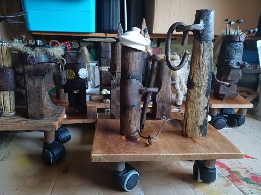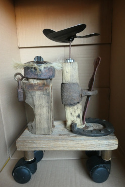Die Entrückten Die Entrückten waren in ihrem ersten Leben mal ein Leiterwagen, der von Ochsen oder Kühen gezogen wurde. Als jener in der alten Scheune im Weg war, wurde der Beschluss gefasst, ihn zu verbrennen. Leider enthielt er eiserne Teile, die nicht verbrennbar waren. So stellte man diese erstmal zur Seite um zu überlegen, was zu tun war. Das ist der Moment, in dem ich ins Spiel kam. Ich rettete die unersetzlichen und unbezahlbaren Stücke....und verwahrte sie viele Jahre in meinem Atelier auf. ....bis mir jetzt die zündende Idee kam. Neun Skulpturen entstanden aus rein nur Gefundenem.