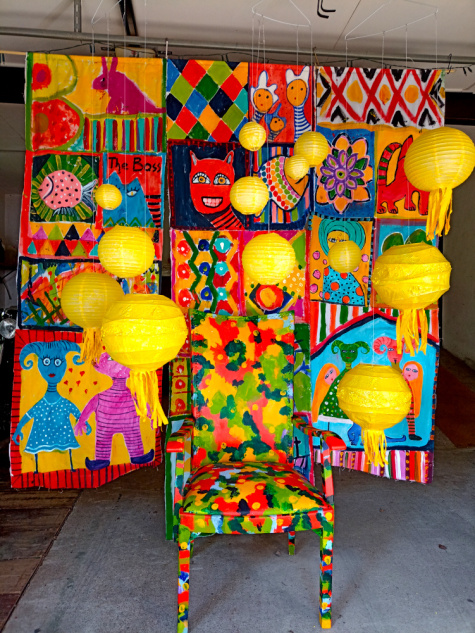 ![]() | Glückshormone Die Installation besteht aus bemalten Teilen eines ehemaligen Bettlakens, einem großen Sessel -ehemals ein Richterstuhl- und farbigen Ballons in verschiedener Größe. Die Bemalung des Tuchs zeigt eine Familiensituation mit ihren speziellen Vorlieben. Die Glückshormone entstehen kontinuierlich innerhalb der Bemalung des Sessels und steigen von dort in die Höhe. Der Sinn dieser Installation besteht darin, dass man sich seines Glücks bewusst sein sollte.